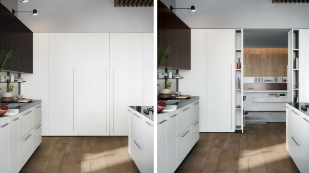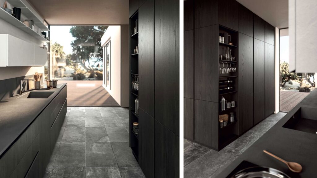Le colonne dispensa con ante a scomparsa rappresentano un’idea innovativa per arredare la cucina in stile minimal.