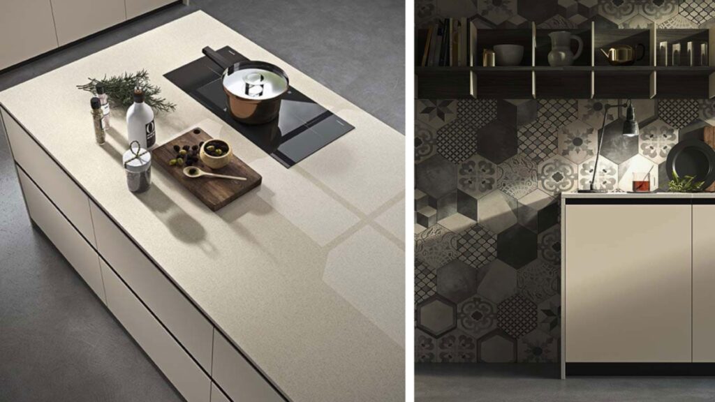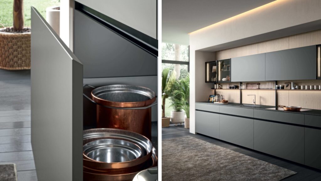 Una modularità trasversale che gioca tra profondità sfaccettate e variazioni di altezza dei moduli. Quindi nell’ambito delle basi, l’opzione spazia tra le basi sospese, con profondità da 35 a 45 a 60cm, e le basi a terra con scocca da 75 cm a scocca da 85 cm. I pensili raggiungono la profondità di 45 cm e aggiungono soprapensili profondi 60cm. Per esempio le colonne si innalzano fino alle altezze di 260cm. Infine, questa modularità dinamica si adatta con agibilità agli spazi, si fonde con il gusto estetico e si allinea ai budget.