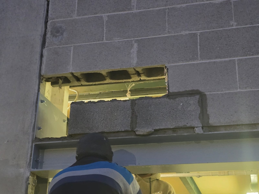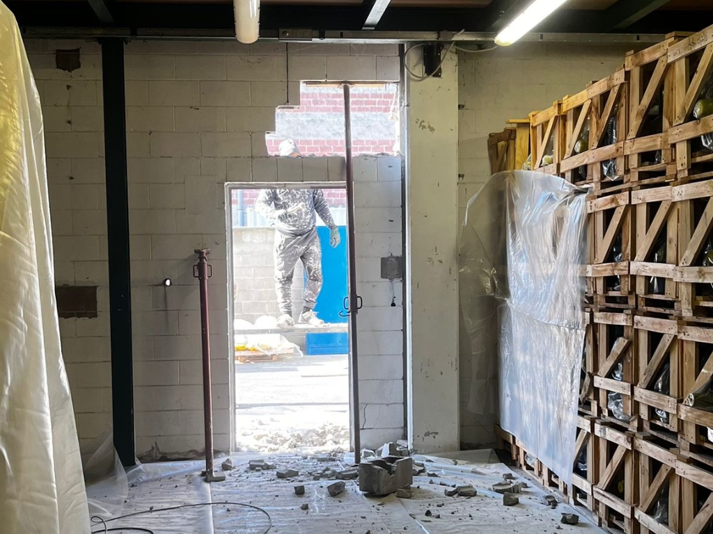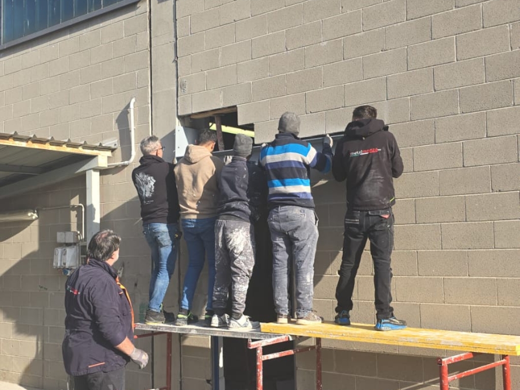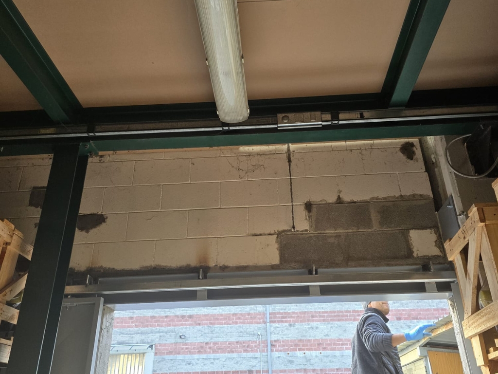 Conclusa la fase di demolizione siamo passati al posizionamento della trave strutturale, elemento fondamentale per garantire la corretta distribuzione dei carichi sopra la nuova apertura. L’installazione è avvenuta con estrema precisione, assicurando il corretto allineamento e ancoraggio. Le operazioni sosno state eseguite in coordinazione con il fabbro e i muratori, così da garantire piena integrazione tra la trave e il sistema di scorrimeto della porta.